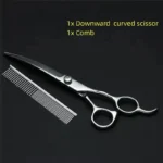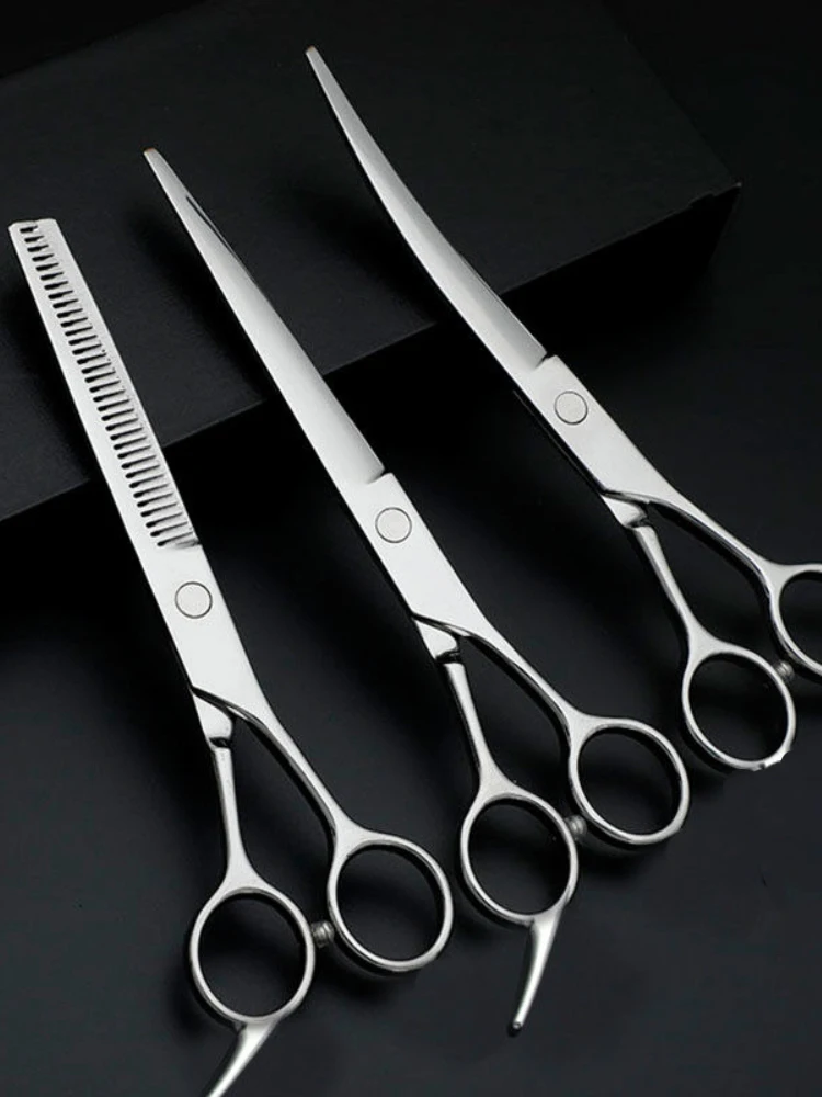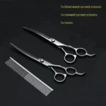 3 scissors set, Flat scissors, Tooth scissors, Up Bent Scissors, nail scissors, 2 Bent scissor Comb, 2 scissors set, Downward bent scisso, Up bent scissor comb, Mouth hair scissor, Foot hair scissors, Downbent scisso comb, Tooth scissos comb, mouth and nail sciss, Foot-Mouth scissor, foot and nail scisso